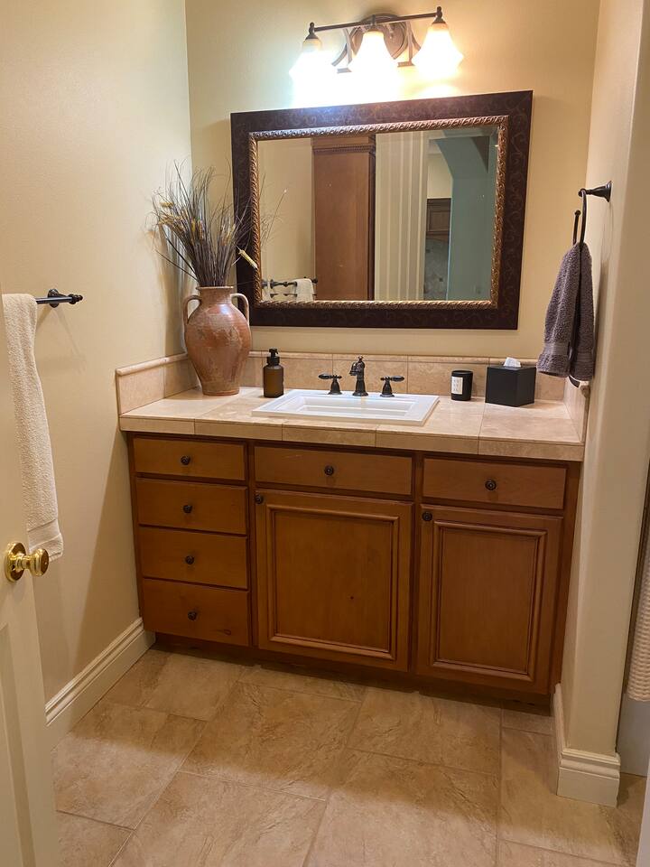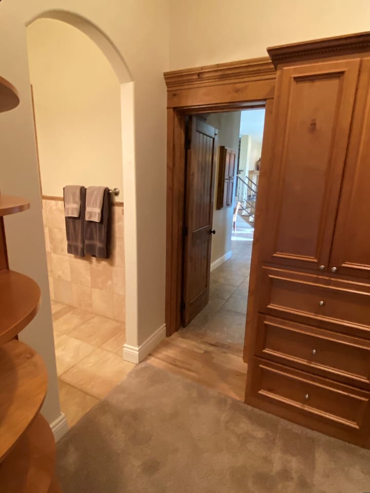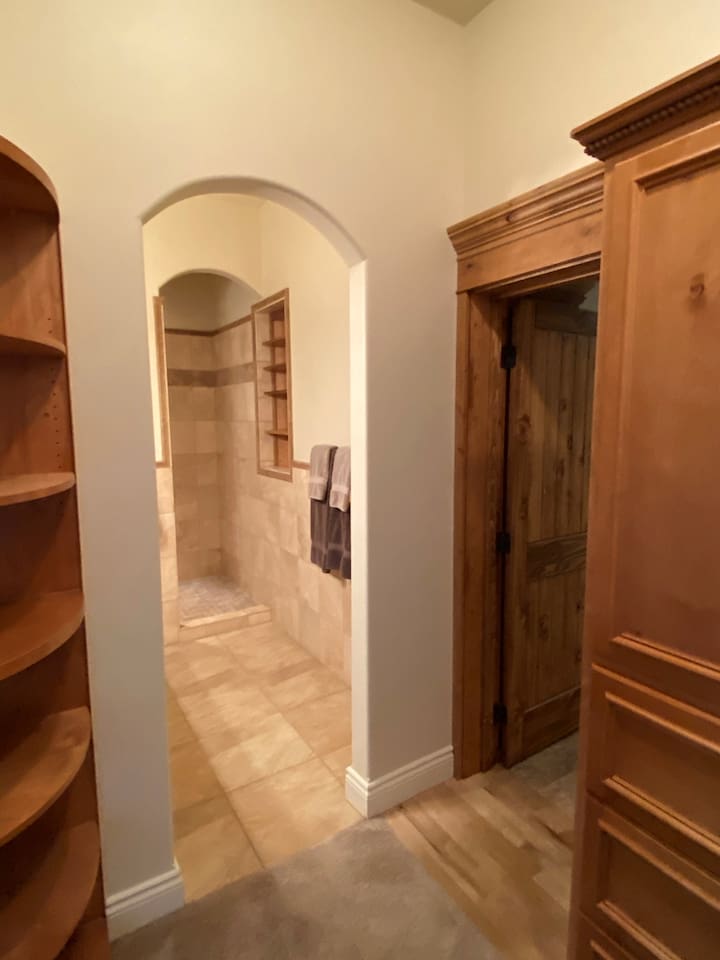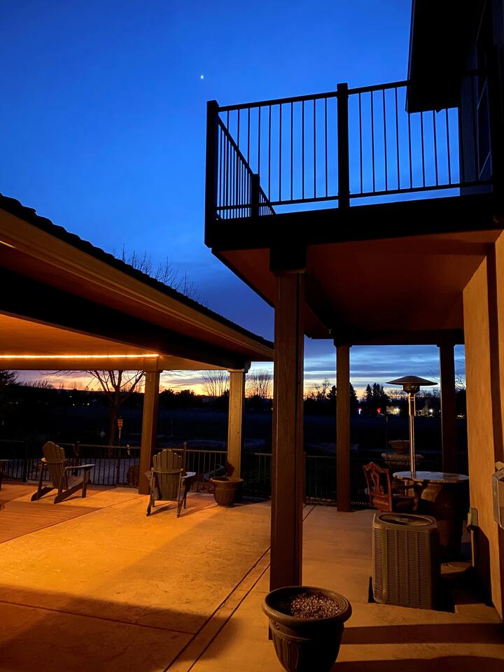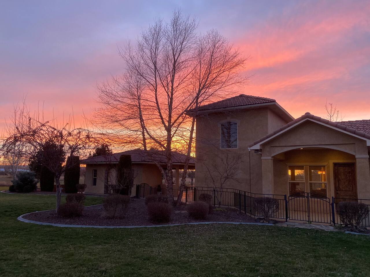 The home is well suited to accommodate larger groups with individual privacy in two wings accessible through the villa or from the outside. Overall, it has four and one half bathrooms and four bedrooms with king-sized beds. Each wing has a full kitchen and large family room. The north wing contains a large dining room and three of the bedrooms. Two are fully ensuite, and the third bedroom is immediately adjacent to another full bathroom. The south wing is two stories and has a large bedroom suite upstairs with a king bed, half bath, and private view terrace. Additionally, a comfy queen sleeper sofa is located in the family room adjacent to the main bath. Relax and recharge in a personal sixteen-foot saltwater spa and barbecue on the covered patio. Enjoy the magnificent sunrises and sunsets, or close out the evening next to the firepit. These accommodations are well-appointed for your stay, with plush bedding and luxurious linens. The kitchens are well-equipped for cooking. Coffee and common condiments and spices are provided. Enjoy a movie or your favorite sporting event on the patio television or play ping-pong or croquet on the grounds. The location is perfect for exploring the countryside. Dozens of wineries are nearby. One of the most beautiful, Yellowhawk Resort, is just across the Walla Walla river, a short nine-minute walk, yet downtown Walla Walla is only five miles away.