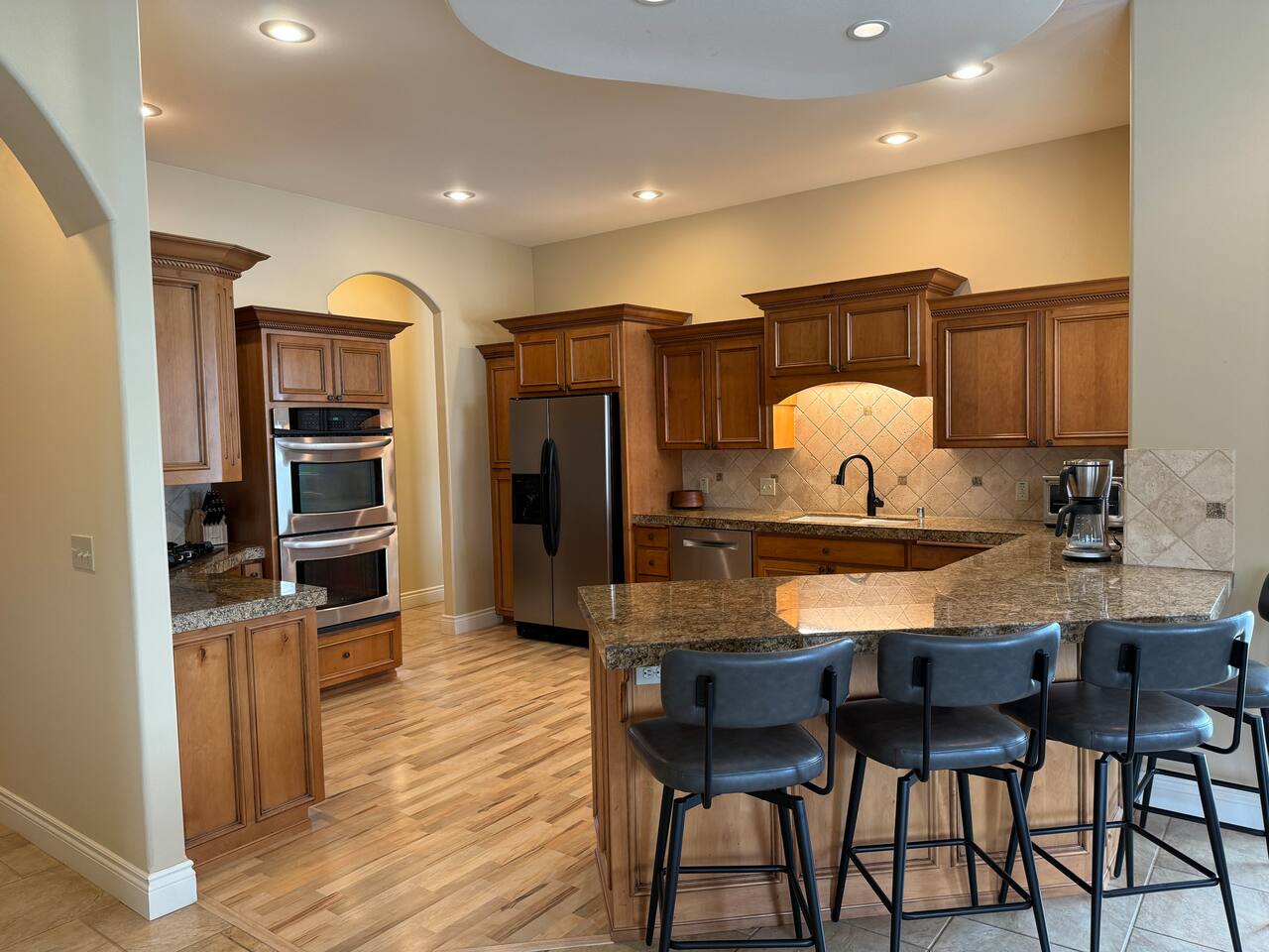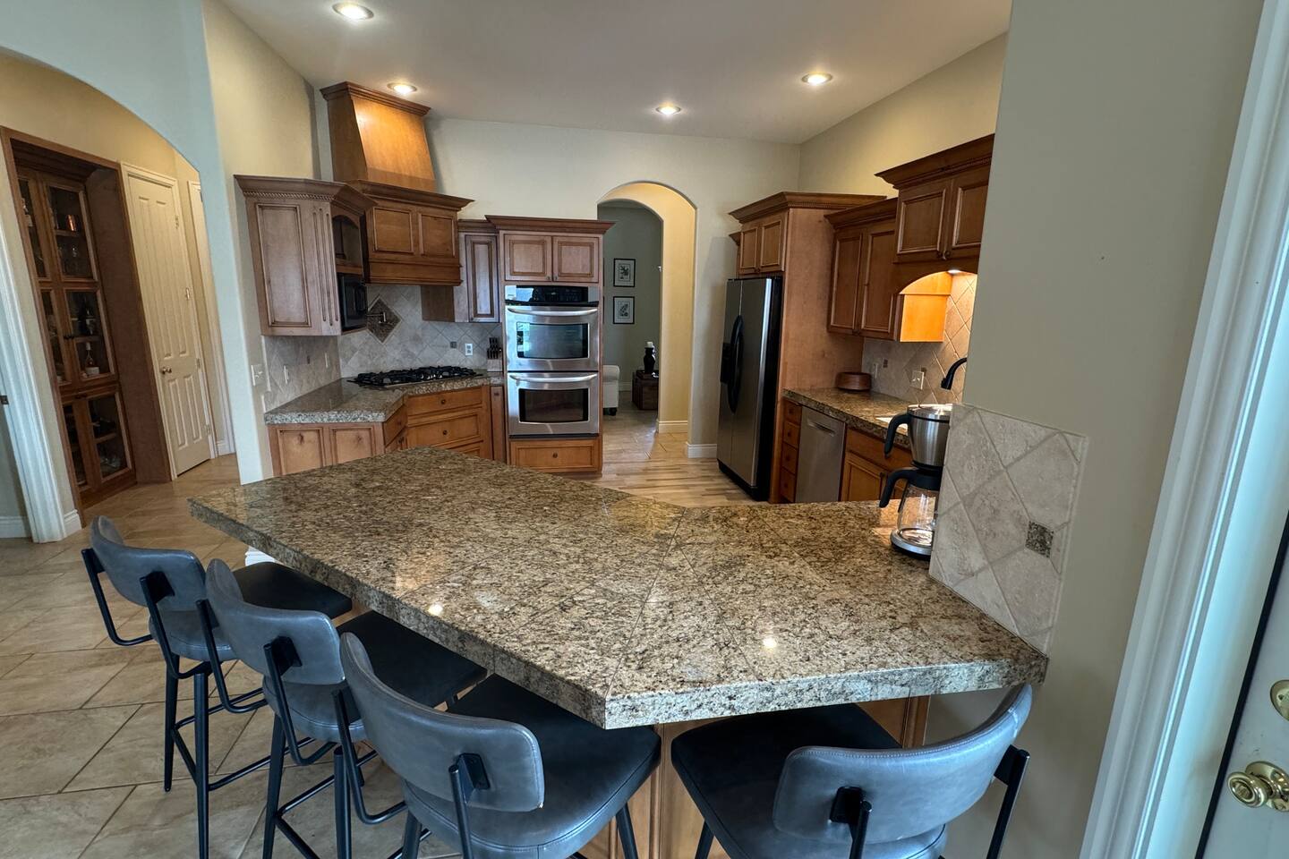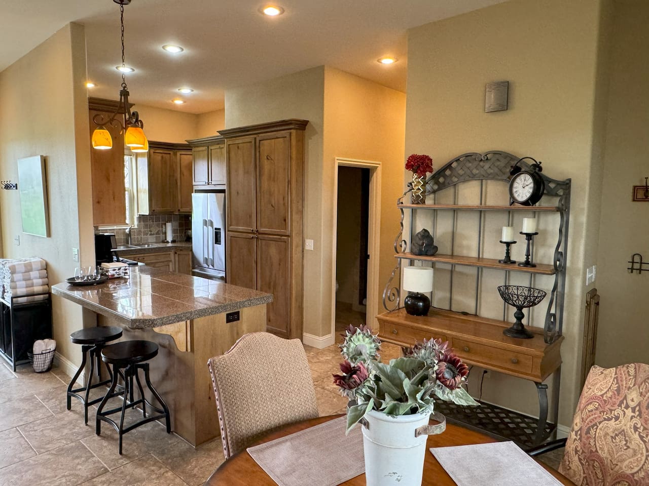 The home is well suited to accommodate larger groups with individual privacy in two wings accessible through the villa or from the outside. Overall, it has four and one half bathrooms and four bedrooms with king-sized beds. Each wing has a full kitchen and large family room. The north wing contains a large dining room and three of the bedrooms. Two are fully ensuite, and the third bedroom is immediately adjacent to another full bathroom. The south wing is two stories and has a large bedroom suite upstairs with a king bed, half bath, and private view terrace. Additionally, a comfy queen sleeper sofa is located in the family room adjacent to the main bath. Relax and recharge in a personal sixteen-foot saltwater spa and barbecue on the covered patio. Enjoy the magnificent sunrises and sunsets, or close out the evening next to the firepit. These accommodations are well-appointed for your stay, with plush bedding and luxurious linens. The kitchens are well-equipped for cooking. Coffee and common condiments and spices are provided. Enjoy a movie or your favorite sporting event on the patio television or play ping-pong or croquet on the grounds. The location is perfect for exploring the countryside. Dozens of wineries are nearby. One of the most beautiful, Yellowhawk Resort, is just across the Walla Walla river, a short nine-minute walk, yet downtown Walla Walla is only five miles away.